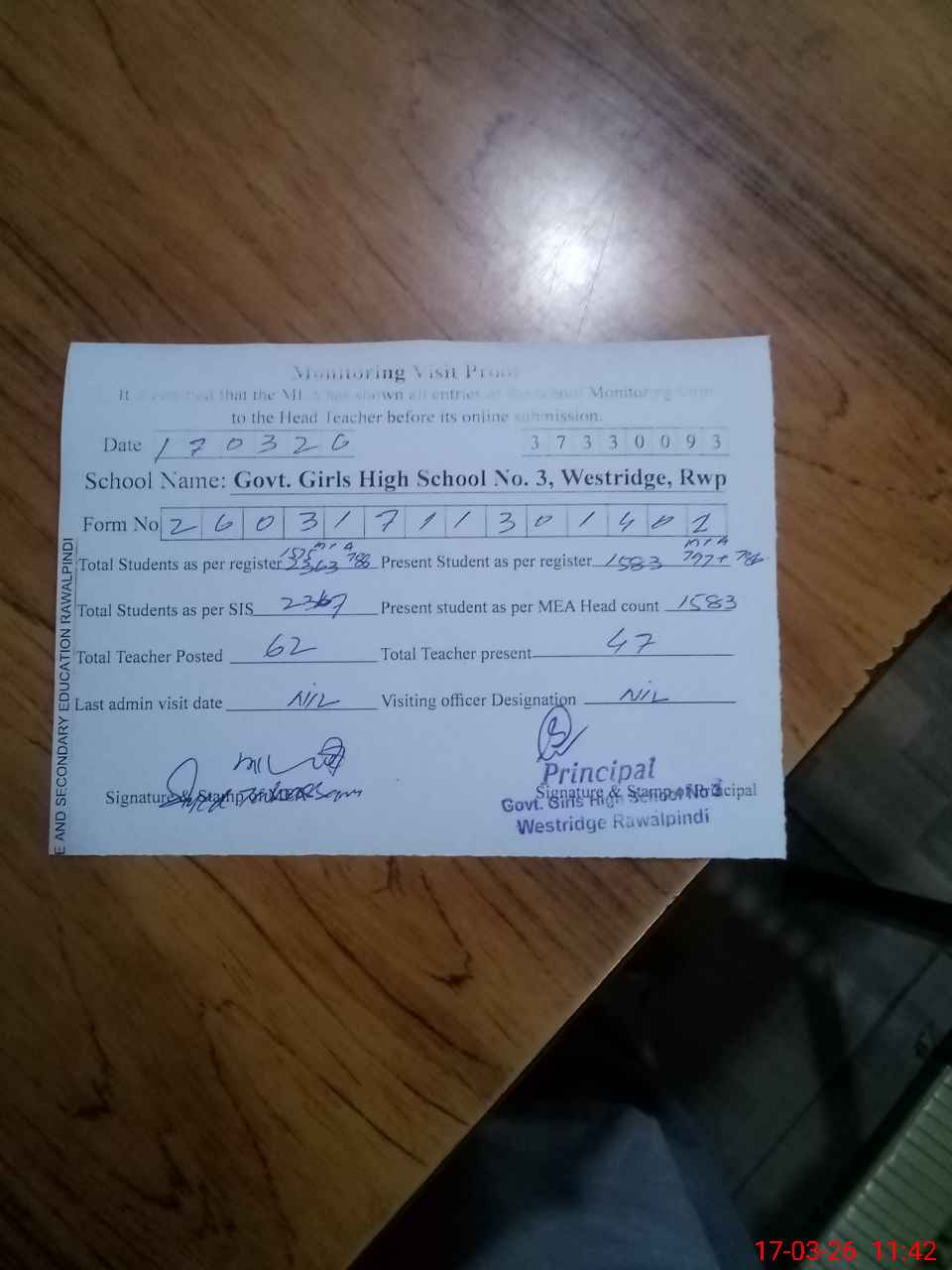 | Attendance Register | Head Teacher | MEA with School | Visit Proof |