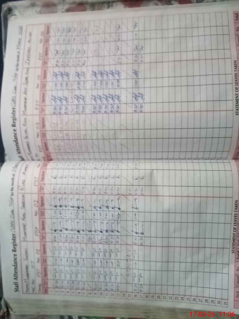 | 31**** | Fa**** Kh**** | ESE (Arts) | Contract | 0 | 0 | 0 | 0 | 0 | 0 | 0 | 0 | 0 | Absent (Un-Authorized) |