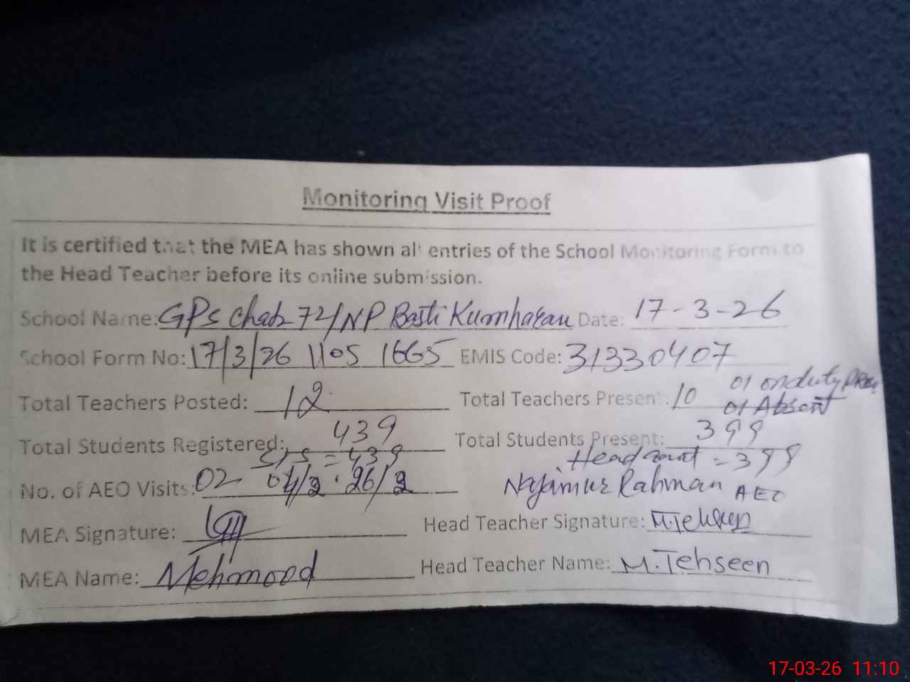 | EMIS Code: 31330407 | Name of School: GPS CHAK 72/NP BASTI KUMHARAN | |||