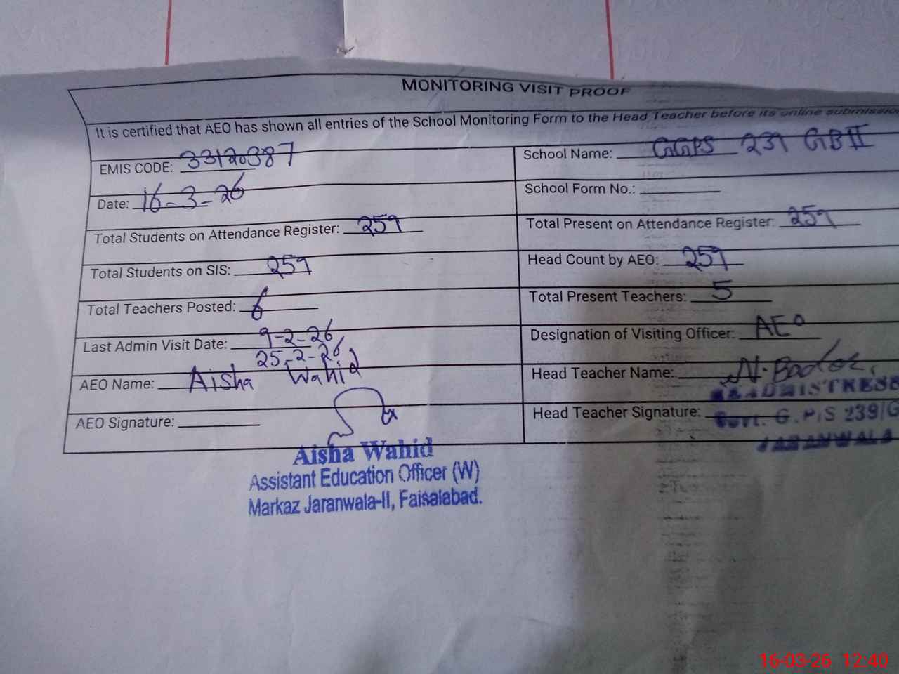| EMIS Code: 33120387 | Name of School: GGPS CHAK 239 GB II JARANWLA | |||