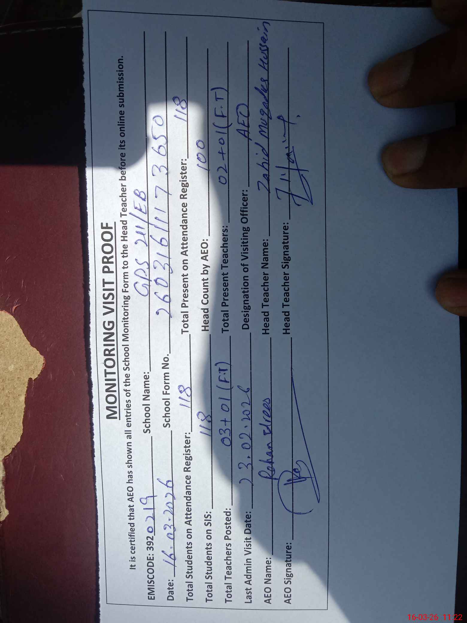 | Attendance Register | Head Teacher | MEA with School | Visit Proof |