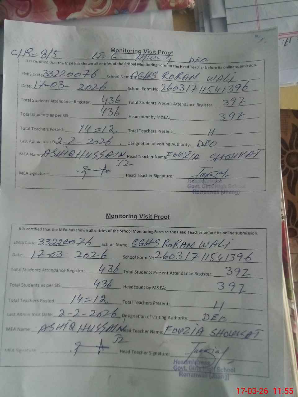 | Attendance Register | Head Teacher | MEA with School | Visit Proof |