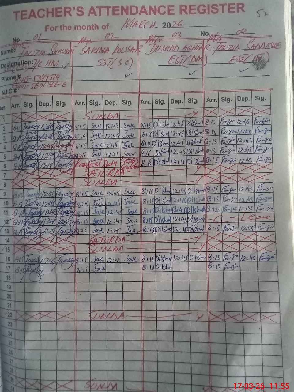 | 33**** | Zu**** Aa**** Ri**** | PST Science/Maths | Regular | 0 | 0 | 28 | 0 | 0 | 0 | 0 | 0 | 0 | Absent (Un-Authorized) |