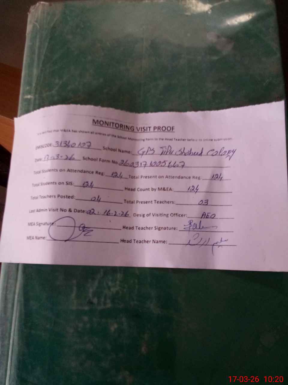 | Attendance Register | Head Teacher | MEA with School | Visit Proof |