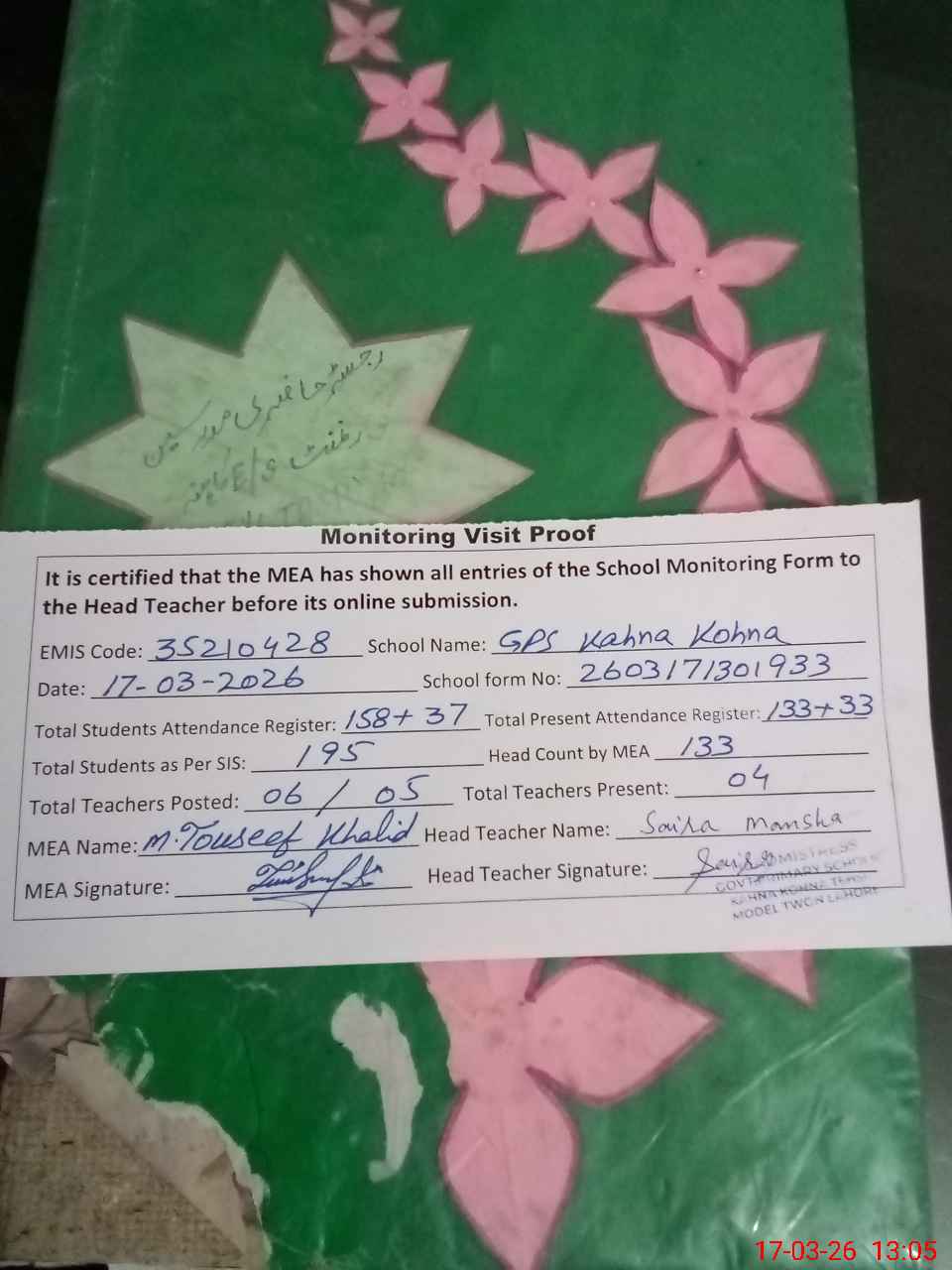 | Attendance Register | Head Teacher | MEA with School | Visit Proof |