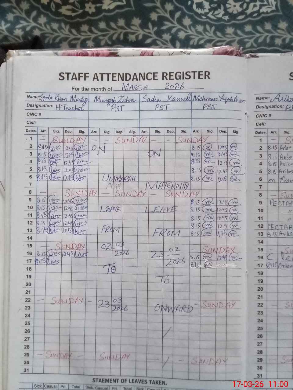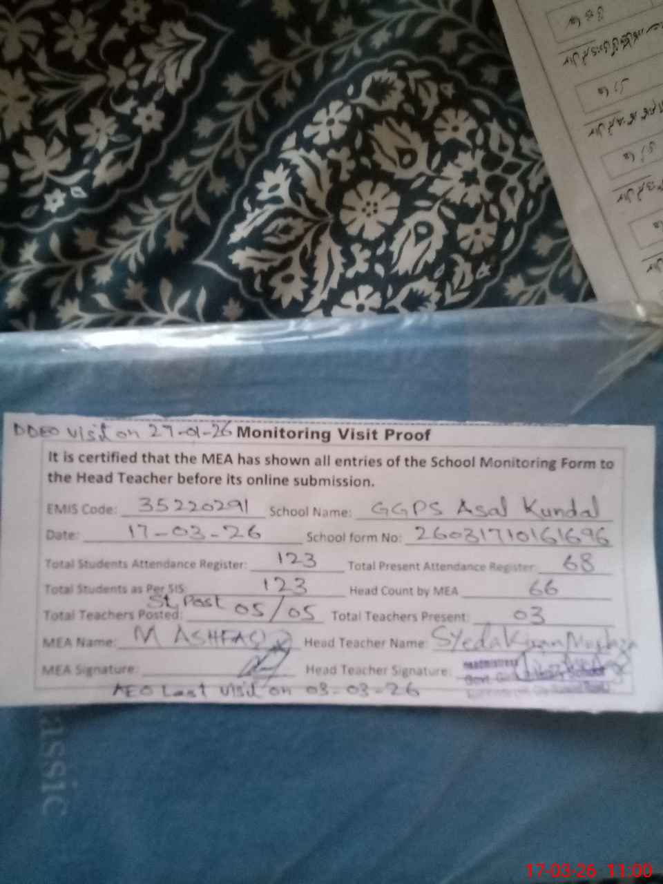 | Remarks (Use Separate Page if Required): PST Munaza Zahra on Ex-Pak leave from 02-03-26 to 23-03-26 her leave approved by DDEO on manually in hard copies but here some problem in SIS not applied in soft form. Classes ECE and Nursery are on off today Last visit by AEO Iqrra Noureen on 03-03-26 DDEO Mehwish Aqeel visited on 27-01-26 Whole the school building looking average condition Floor broken at several points Roofs of classrooms looking poor condition Paint work required 35220291 | |||||