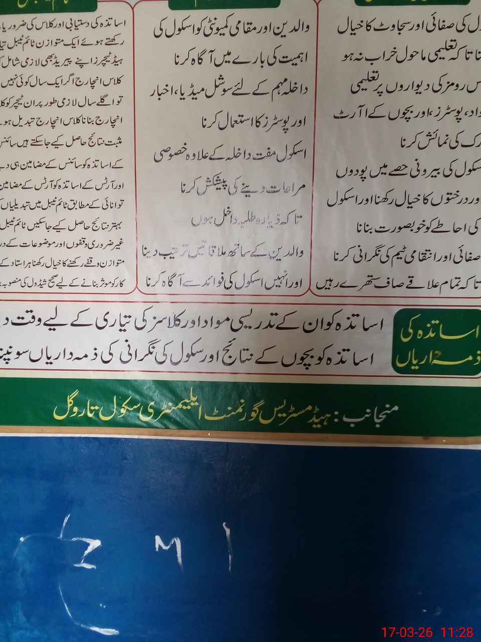 | Remarks (Use Separate Page if Required): Last visit by AEO Waleed Ashraf on 06-03-26 Whole the school building looking average condition School has large ground but looking muddy Several iron windows broken Cleaning is not up to standard 35220210 | |||||