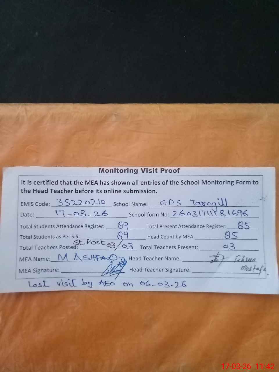 | Attendance Register | Head Teacher | MEA with School | Visit Proof |