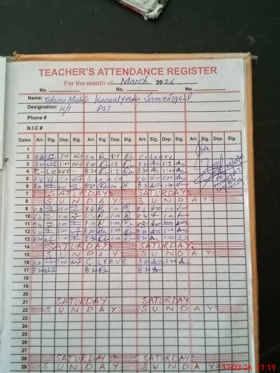 | CNIC | Full Name | Designation | R/C | Absence During Last Calender Month |