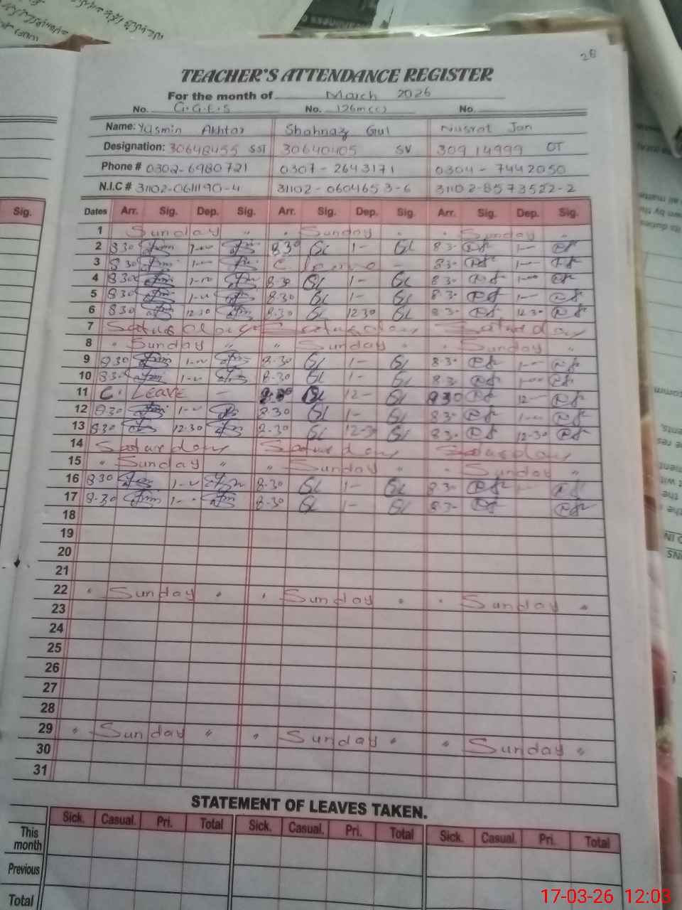 | CNIC | Full Name | Designation | R/C | Absence During Last Calender Month |