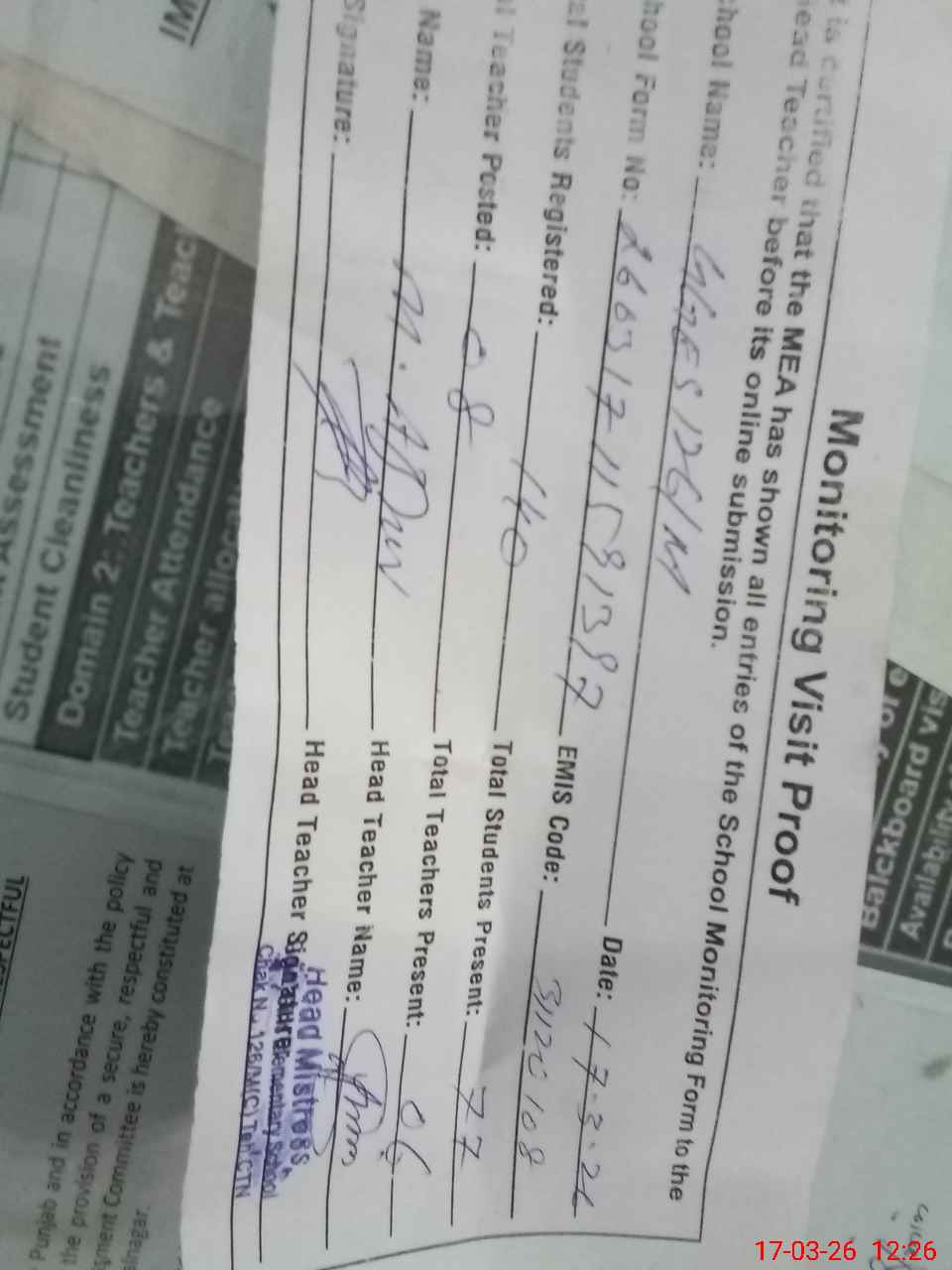 | Attendance Register | Head Teacher | MEA with School | Visit Proof |