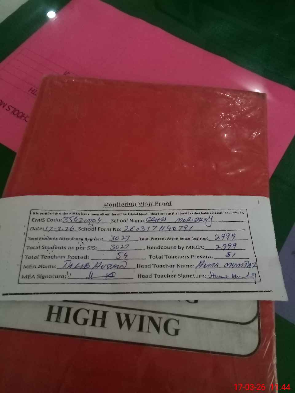 | District: SHEIKHUPURA | Tehsil: MURIDKE | Markaz: SECONDARY-WING | Level: H.Sec. | |