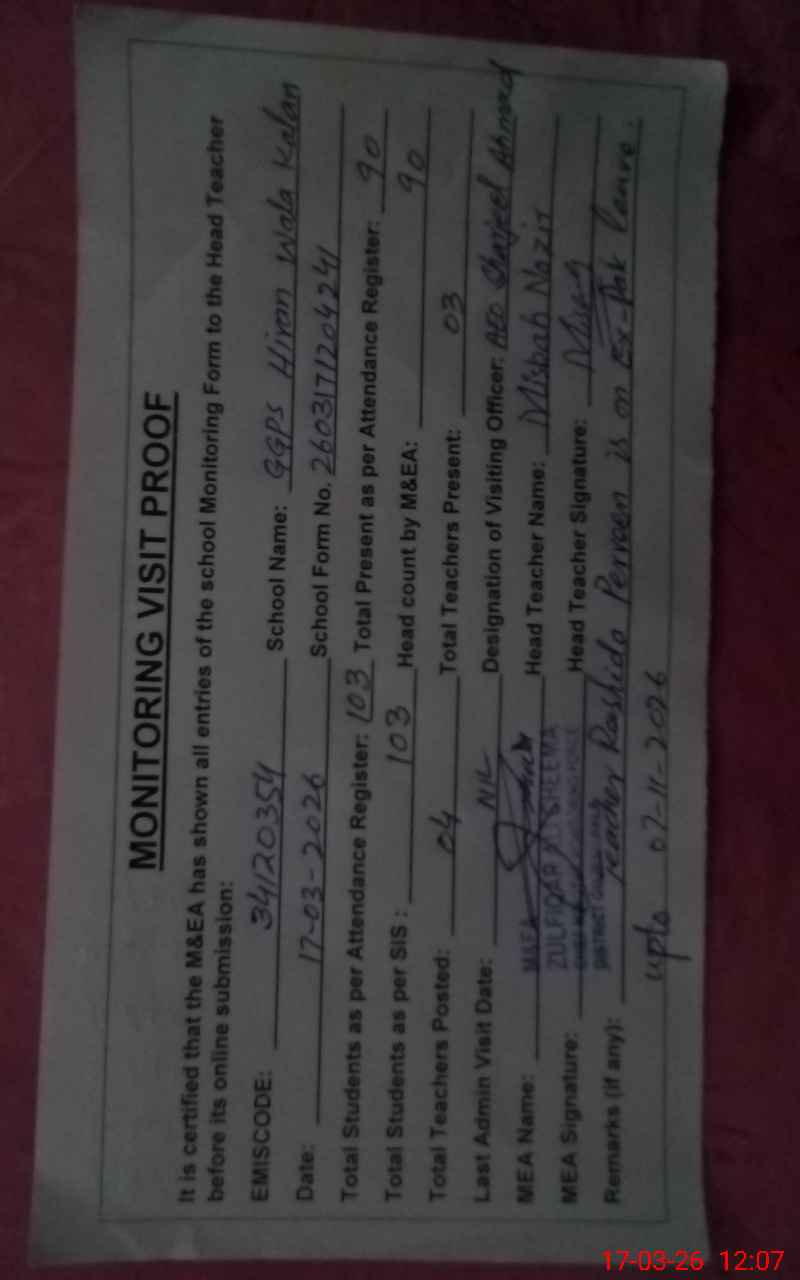 | EMIS Code: 34120354 | Name of School: GGPS HIRAN WALA KALAN | |||