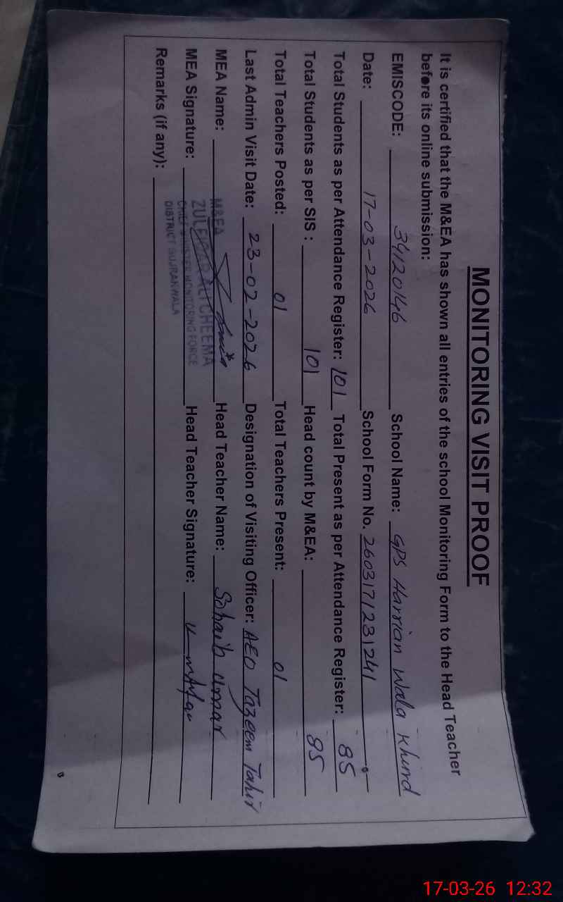 | EMIS Code: 34120146 | Name of School: GPS HARRIAN WALA KHURID | |||