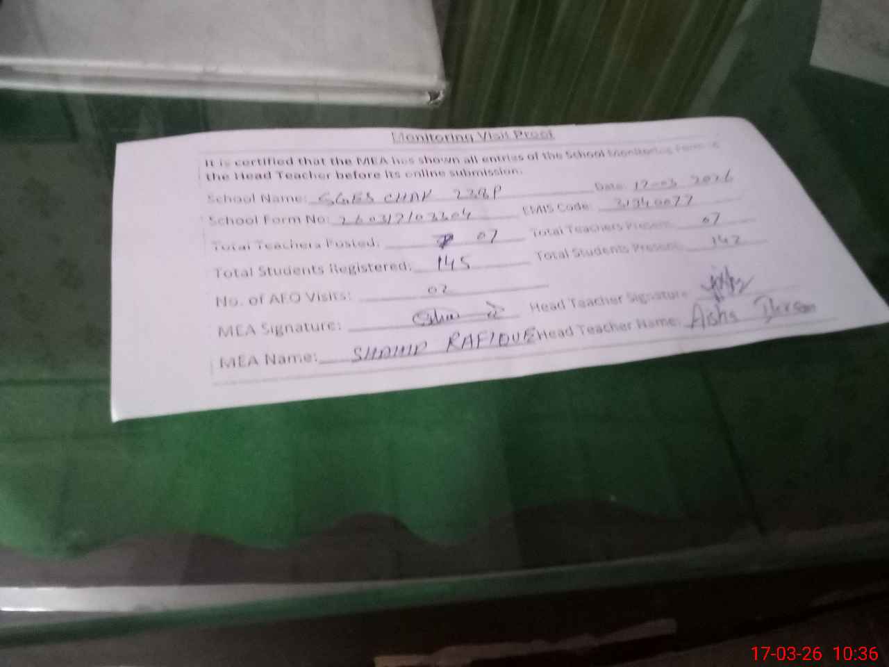 | Attendance Register | Head Teacher | MEA with School | Visit Proof |