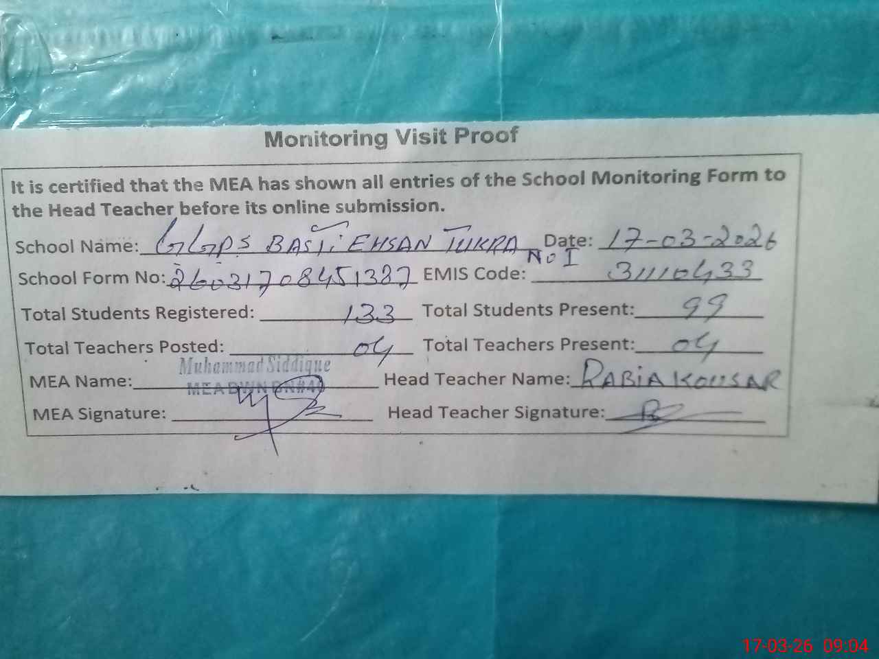 | Attendance Register | Head Teacher | MEA with School | Visit Proof |