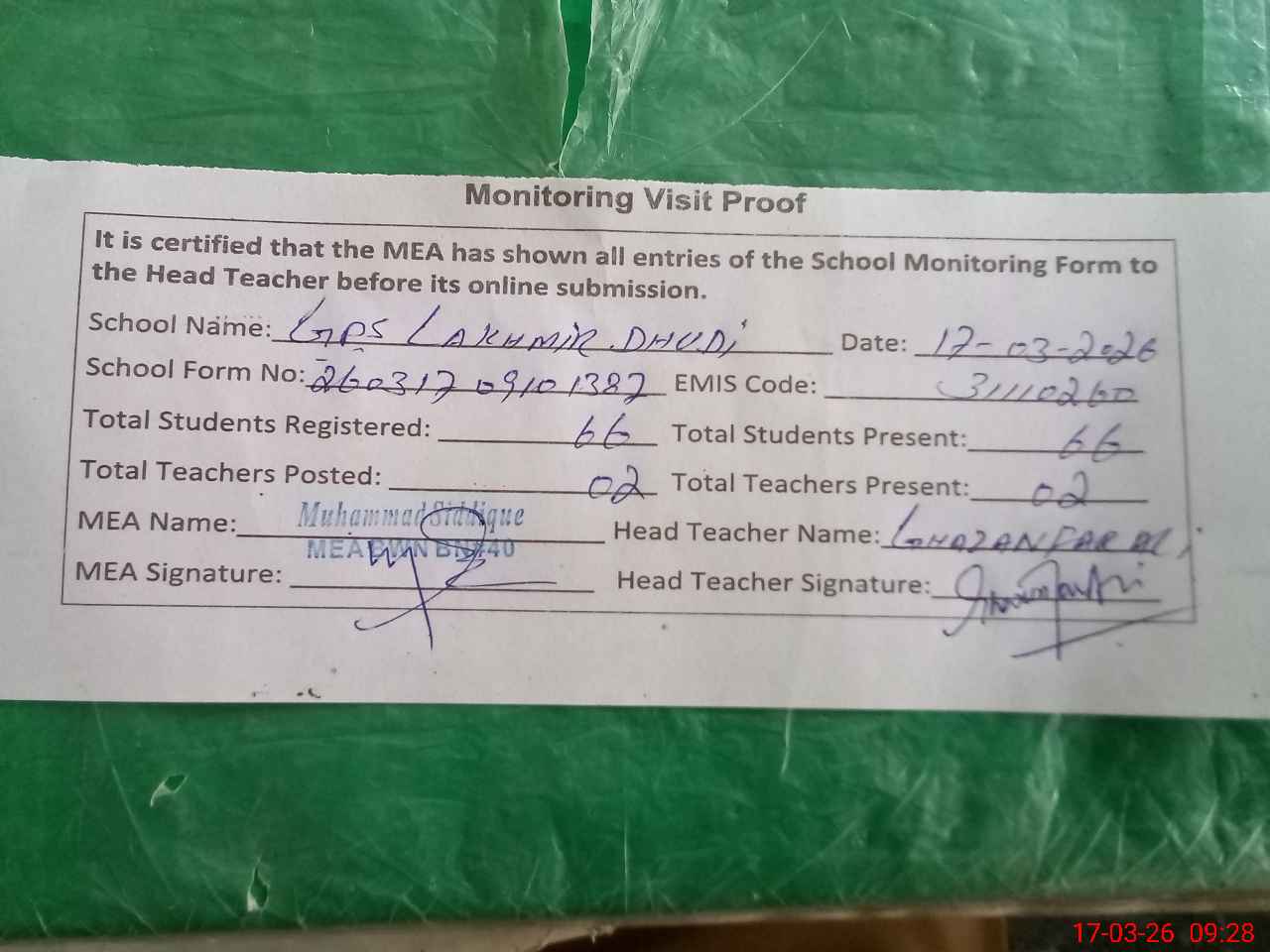 | Attendance Register | Head Teacher | MEA with School | Visit Proof |