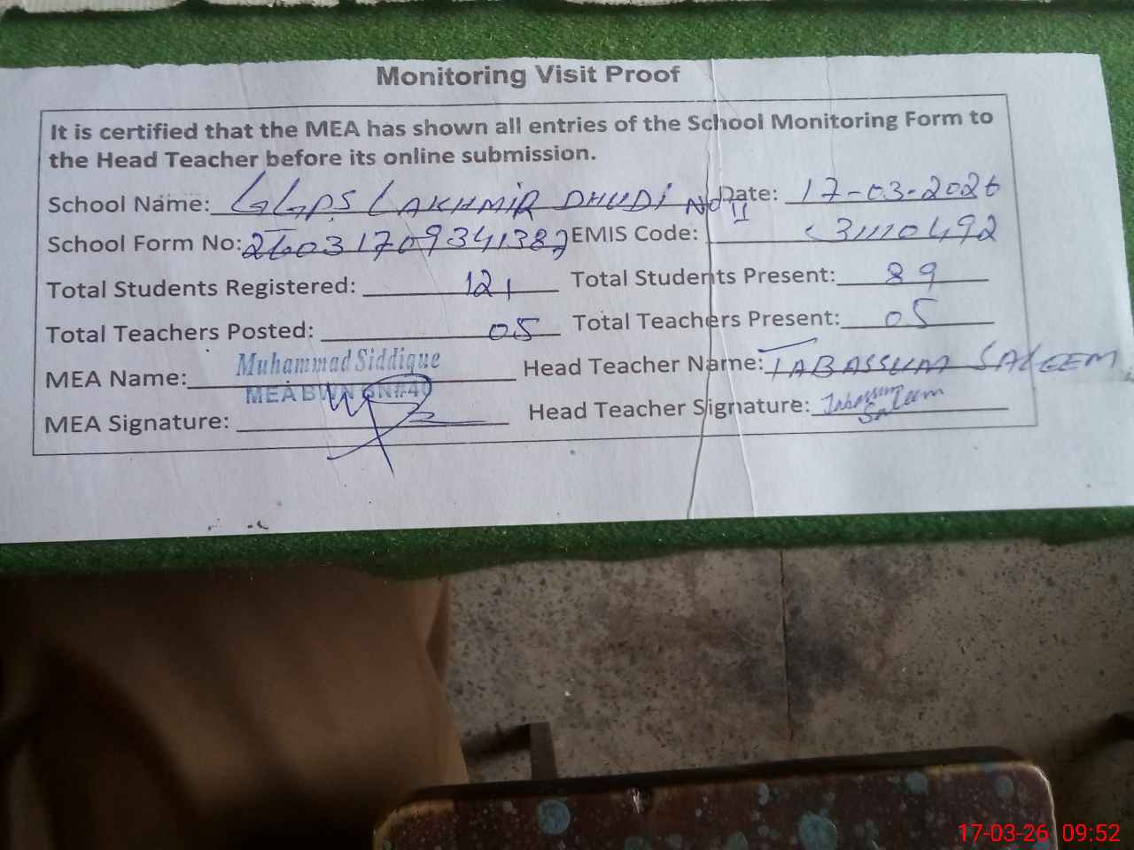 | Attendance Register | Head Teacher | MEA with School | Visit Proof |
