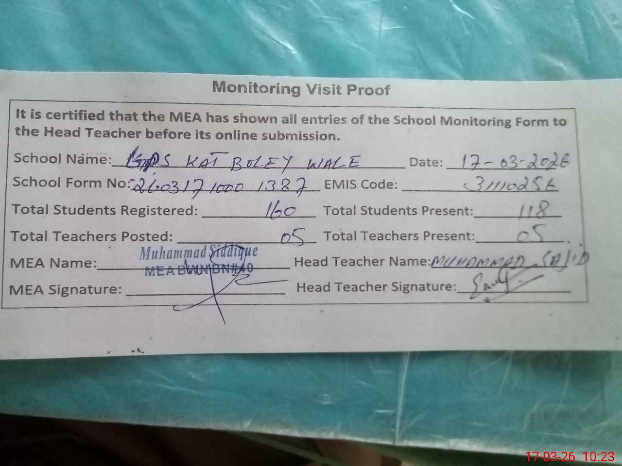 | Attendance Register | Head Teacher | MEA with School | Visit Proof |