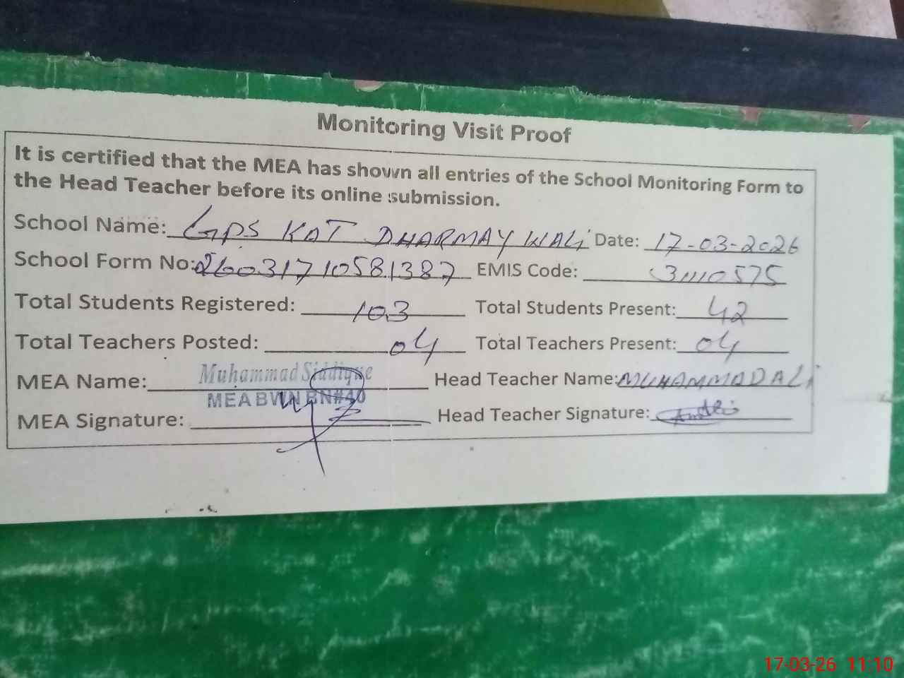 | EMIS Code: 31110575 | Name of School: GPS KAT DHARMAY WALI | |||