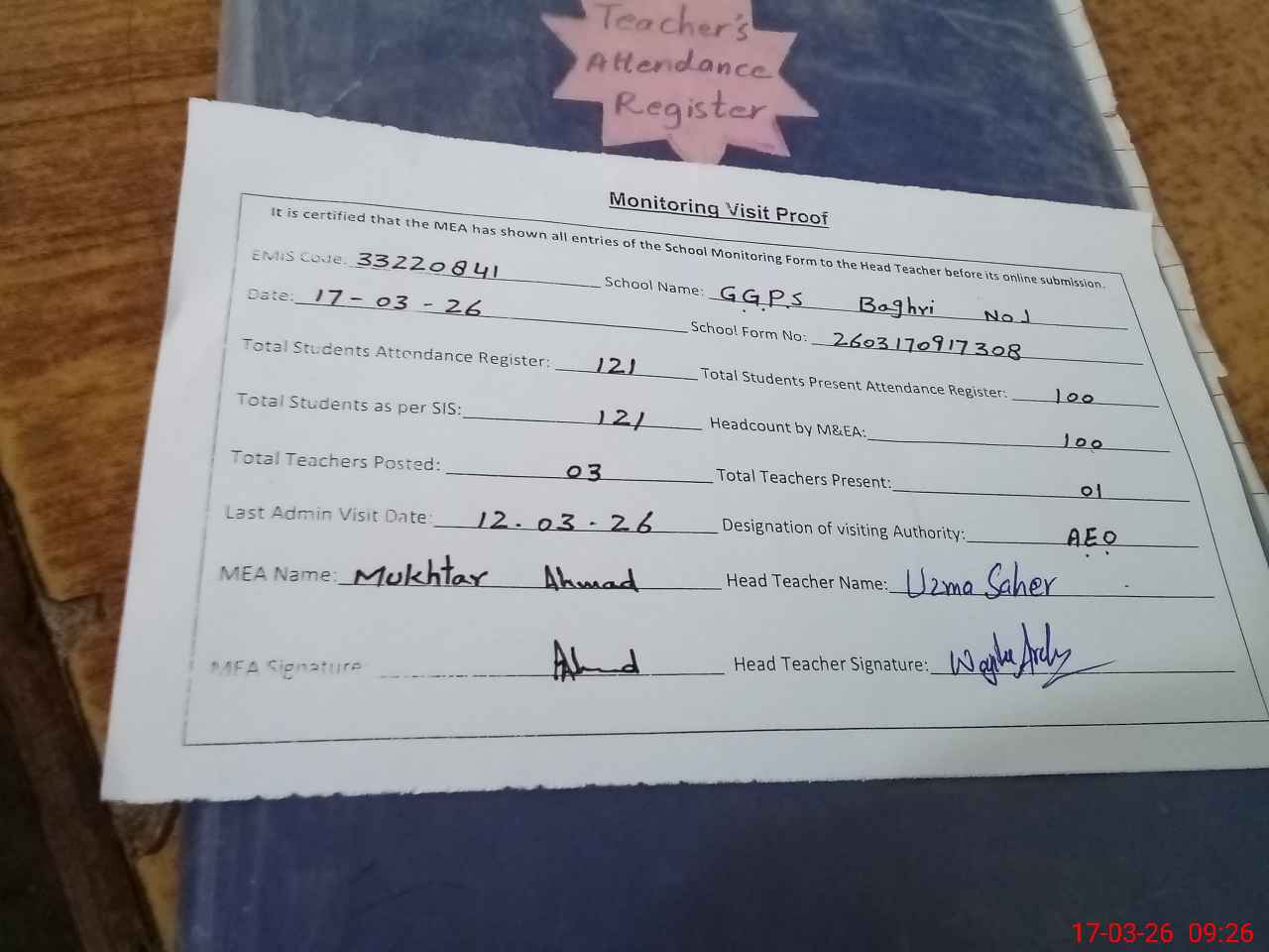 | Attendance Register | Head Teacher | MEA with School | Visit Proof |