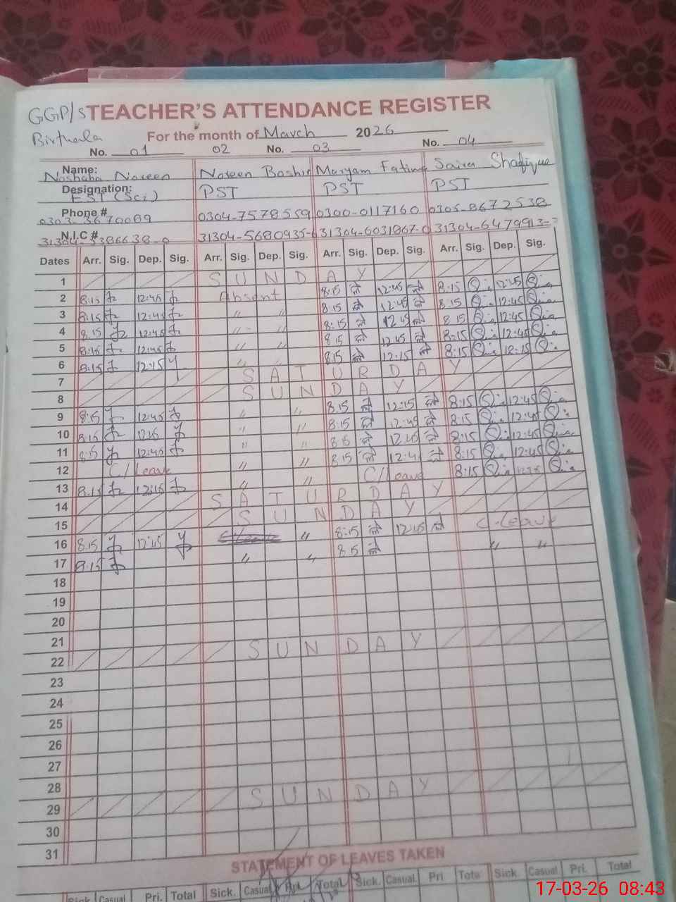| 31**** | No**** Ba**** | ESE (Arts) | Contract | 0 | 0 | 28 | 0 | 0 | 0 | 0 | 0 | 0 | Absent (Un-Authorized) |