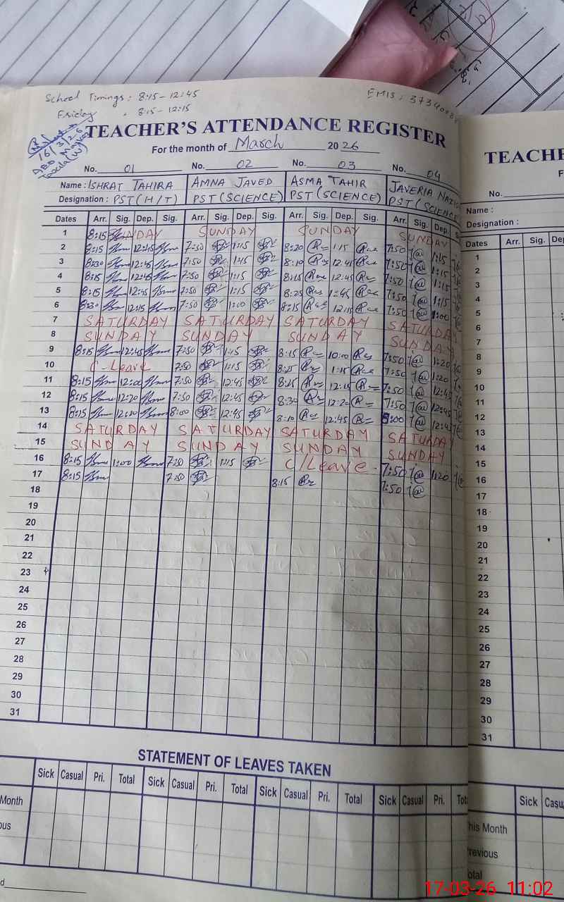 | CNIC | Full Name | Designation | R/C | Absence During Last Calender Month |