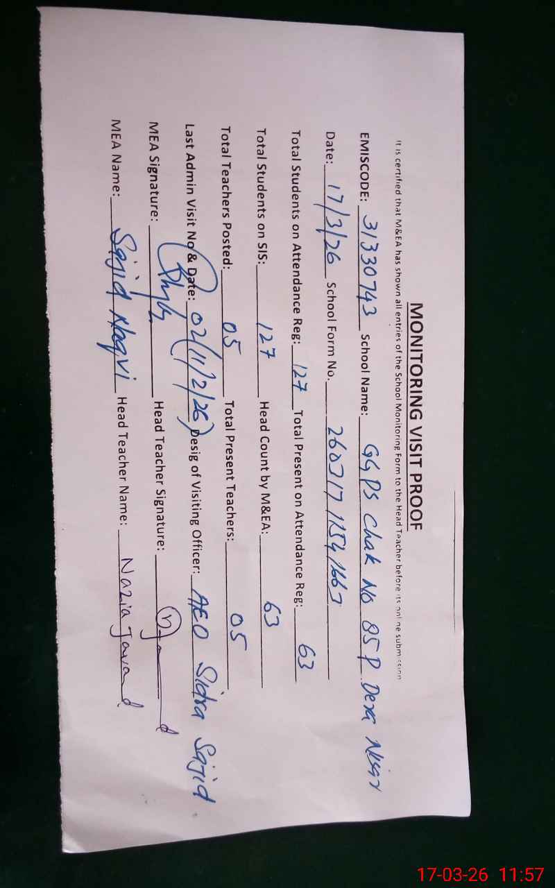 | EMIS Code: 31330743 | Name of School: GGPS CHAK 85/P DERA NISAR | |||