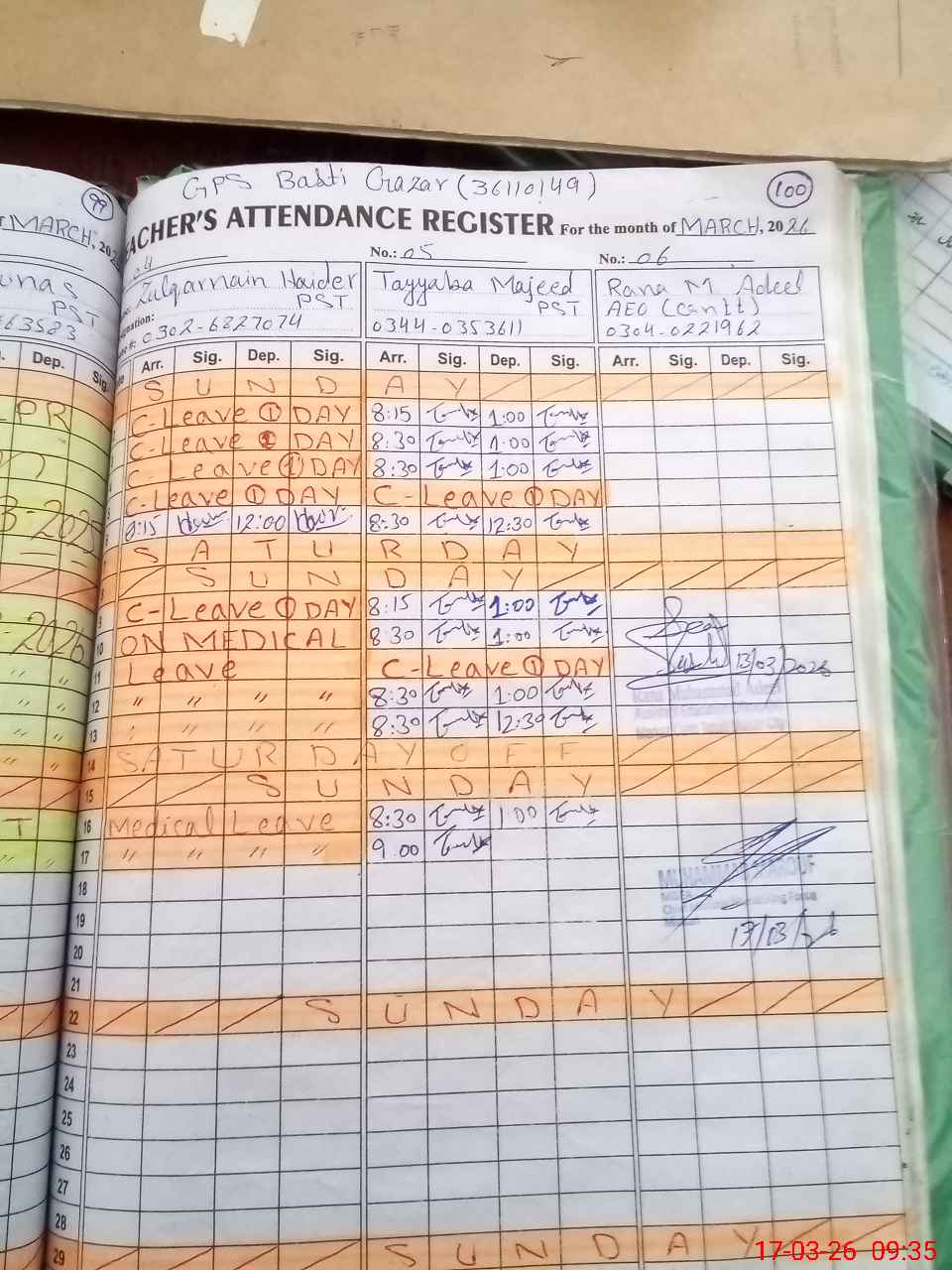 | Remarks (Use Separate Page if Required): PST zulqarnain Haider mentioned medical leave on attendance rejister from 10th Mar to 19th Mar 26 but no leave sanctioned record provided marked as absent | |||||
