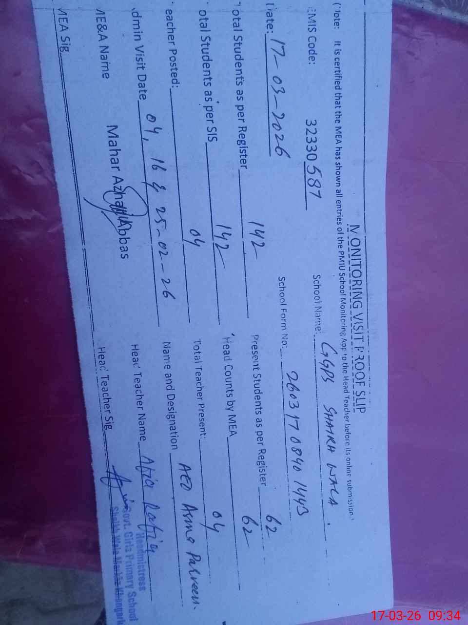 | Attendance Register | Head Teacher | MEA with School | Visit Proof |