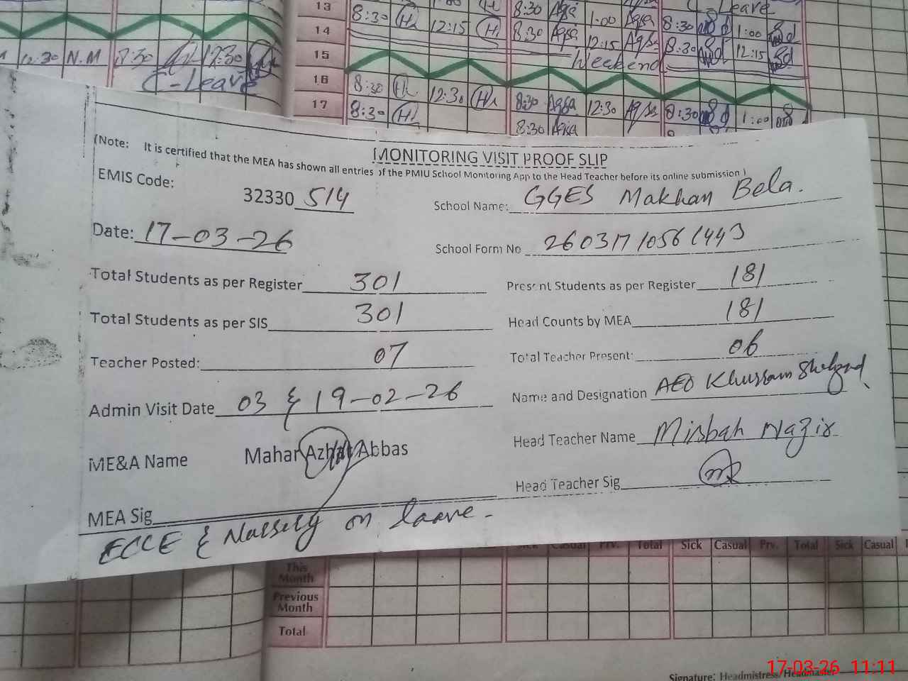 | Attendance Register | Head Teacher | MEA with School | Visit Proof |