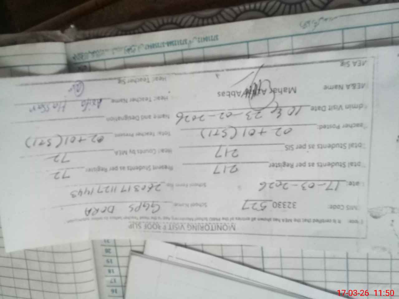 | Attendance Register | Head Teacher | MEA with School | Visit Proof |