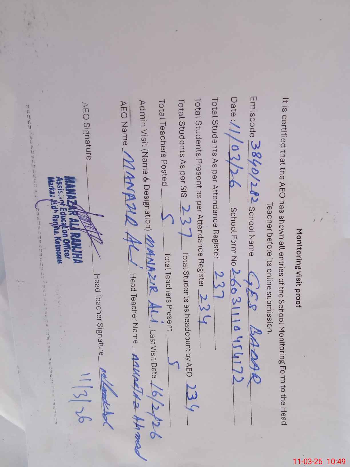 | Certified that this School was Inspected by the Undersigned MEA/DMO Today and the Information Stated Above is as Per Record. | |||||
