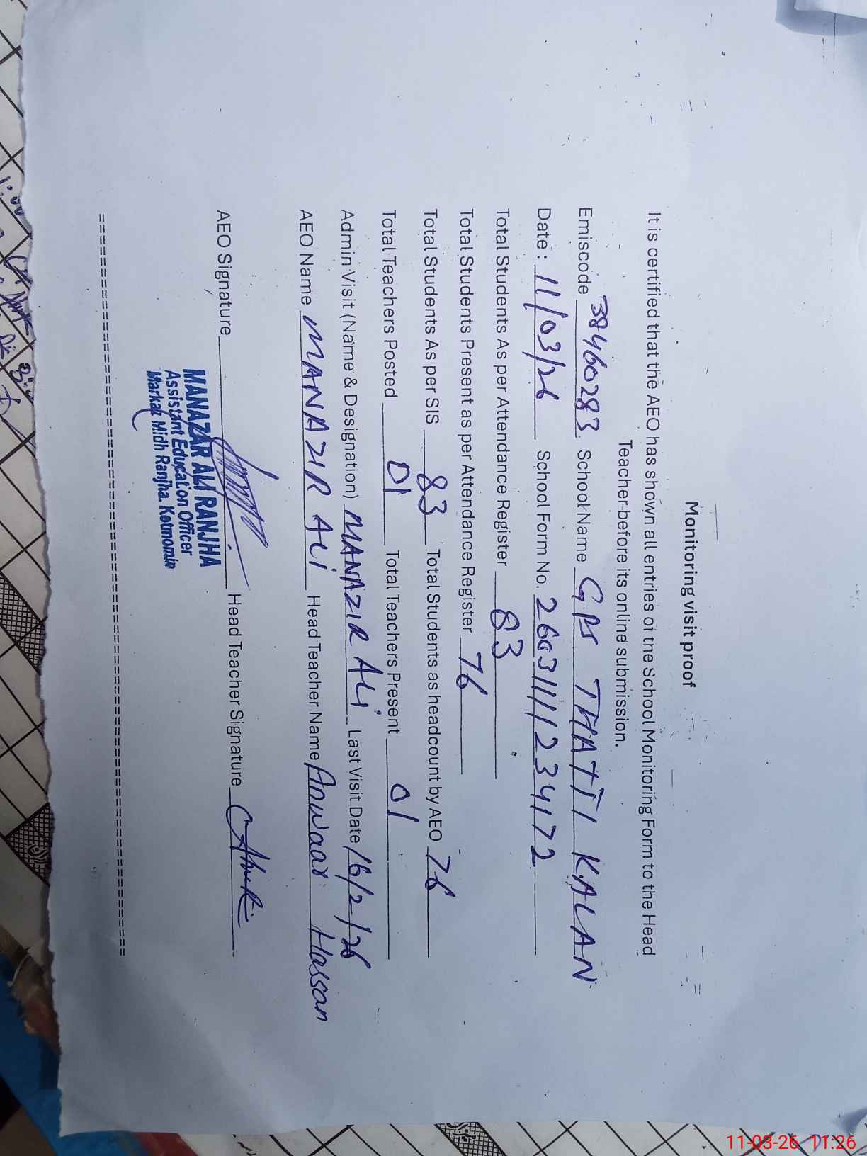 | Monitoring Date: 11-03-2026 | Start Time: 11-03-2026 11:00 AM | End Time: 11-03-2026 11:26 AM | Name of MEA: MA**** AL**** | |
