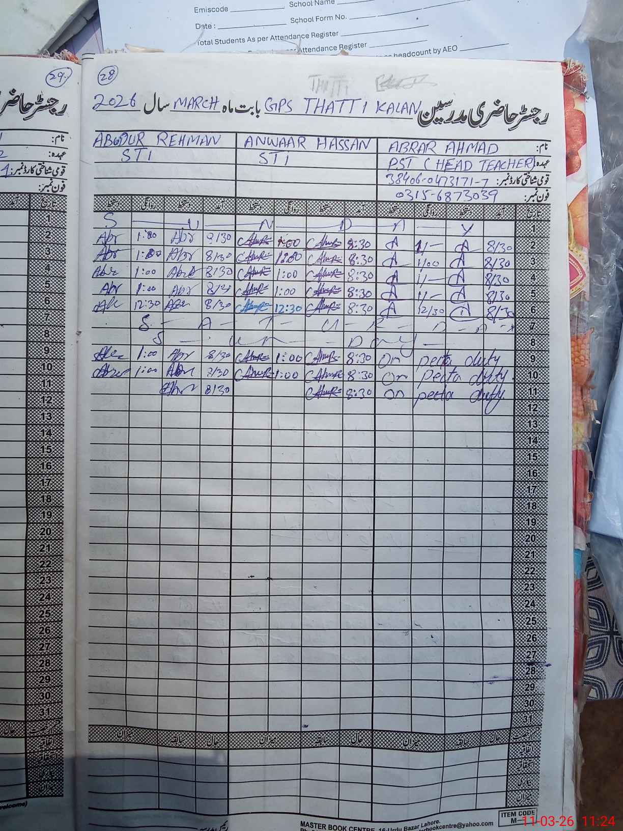 | Name: IB**** AH**** Designation: (School Headmaster's/Headmistress's) PST Phone/Cell Number: 03**** |