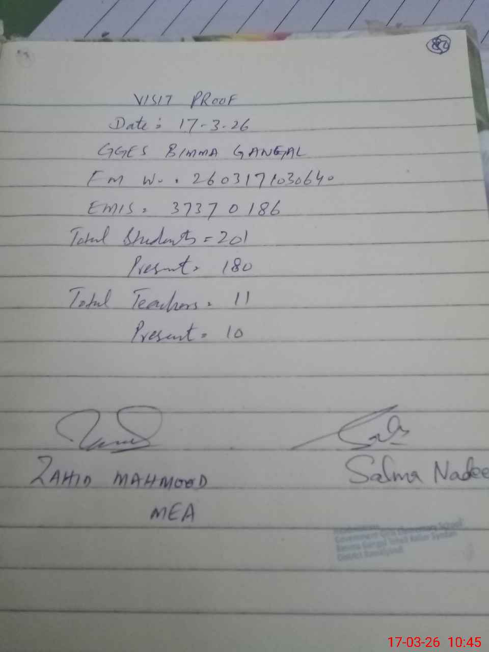 | Attendance Register | Head Teacher | MEA with School | Visit Proof |
