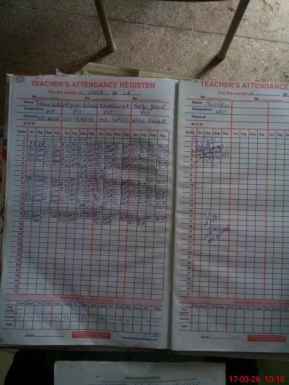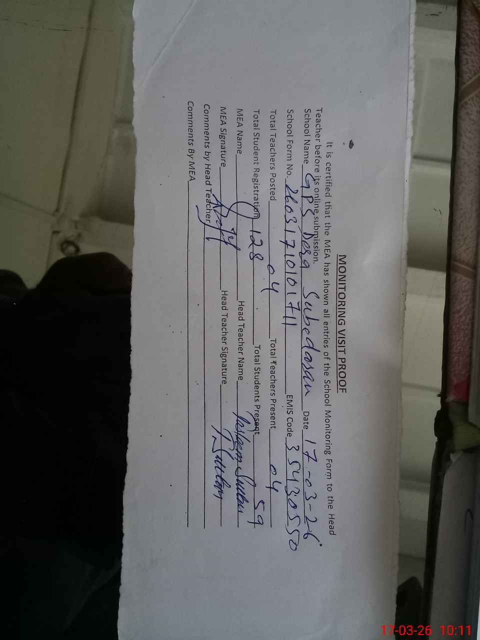 | Attendance Register | Head Teacher | MEA with School | Visit Proof |