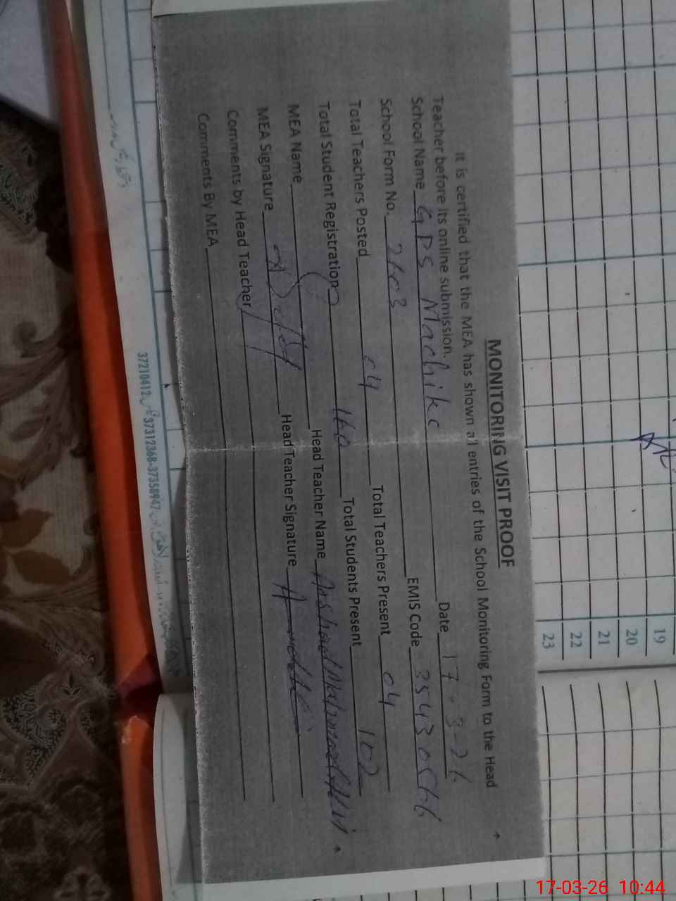 | Attendance Register | Head Teacher | MEA with School | Visit Proof |