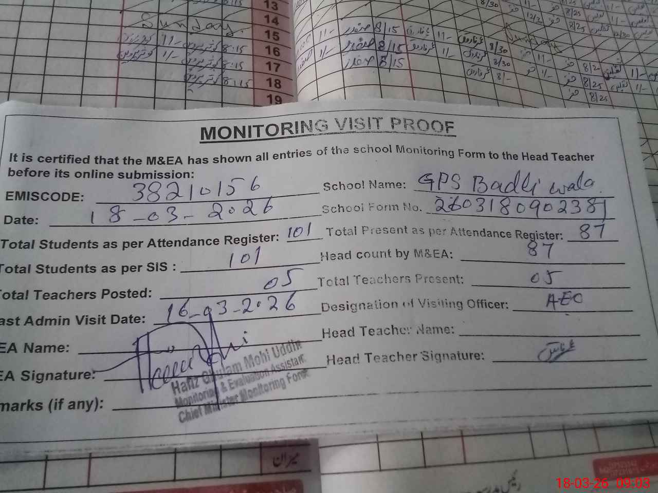 | EMIS Code: 38210156 | Name of School: GPS BADLI WALA | |||