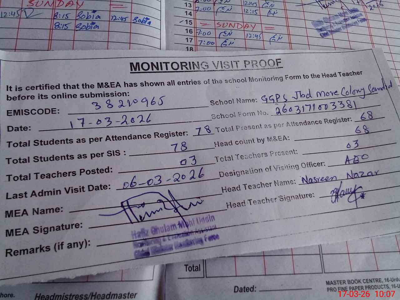| Attendance Register | Head Teacher | MEA with School | Visit Proof |