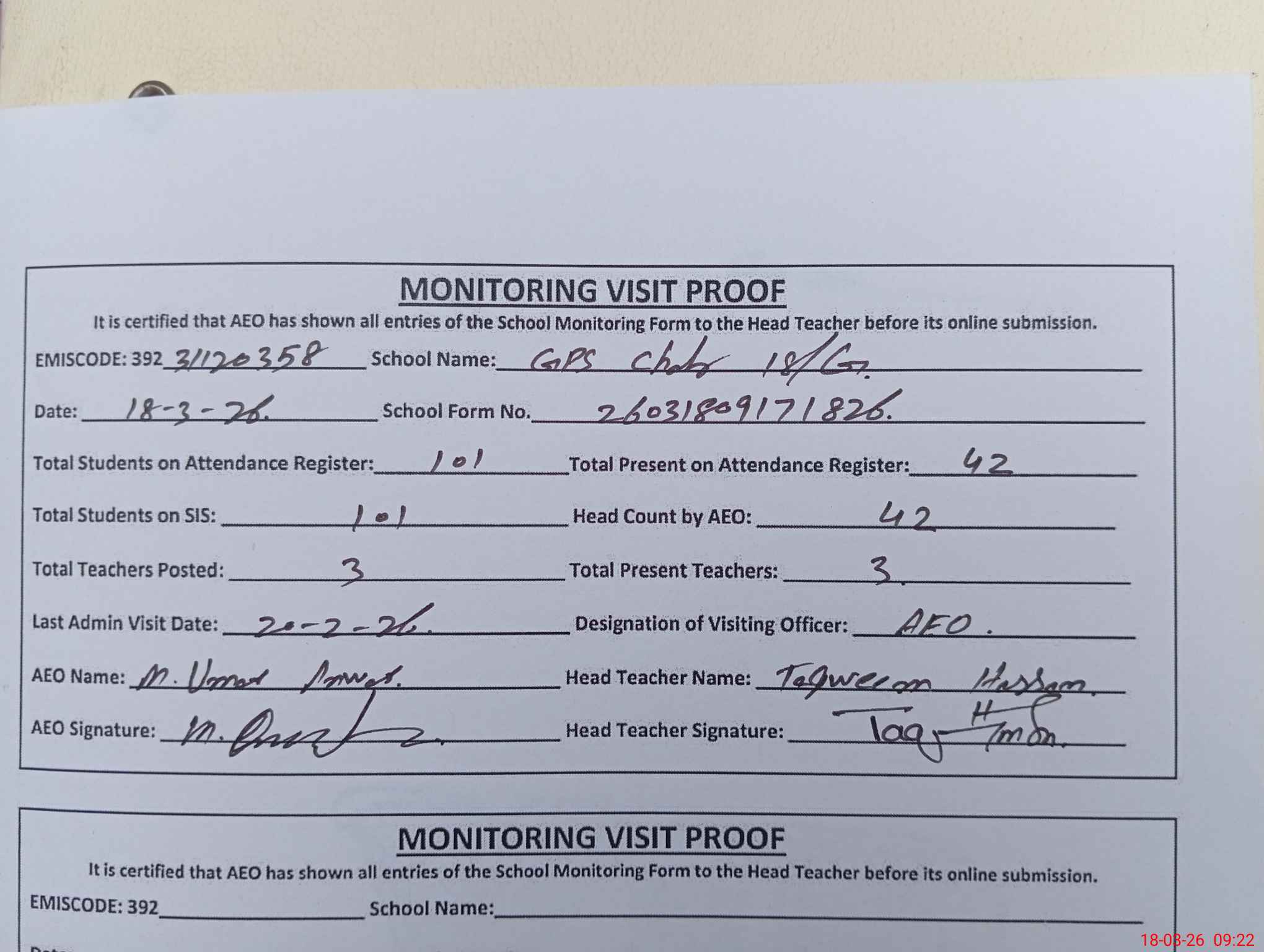 | EMIS Code: 31120358 | Name of School: GPS CHAK NO 18/G | |||