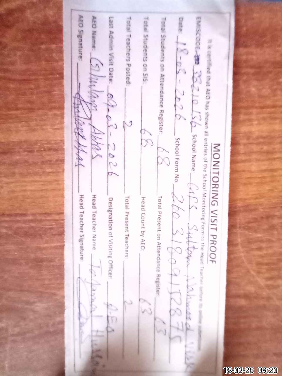| Attendance Register | Head Teacher | MEA with School | Visit Proof |