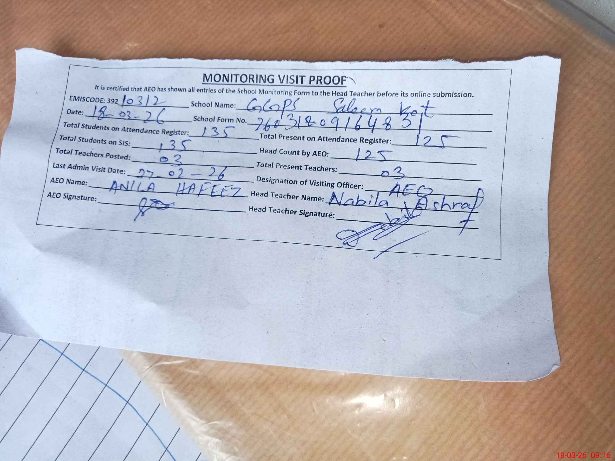 | Attendance Register | Head Teacher | MEA with School | Visit Proof |
