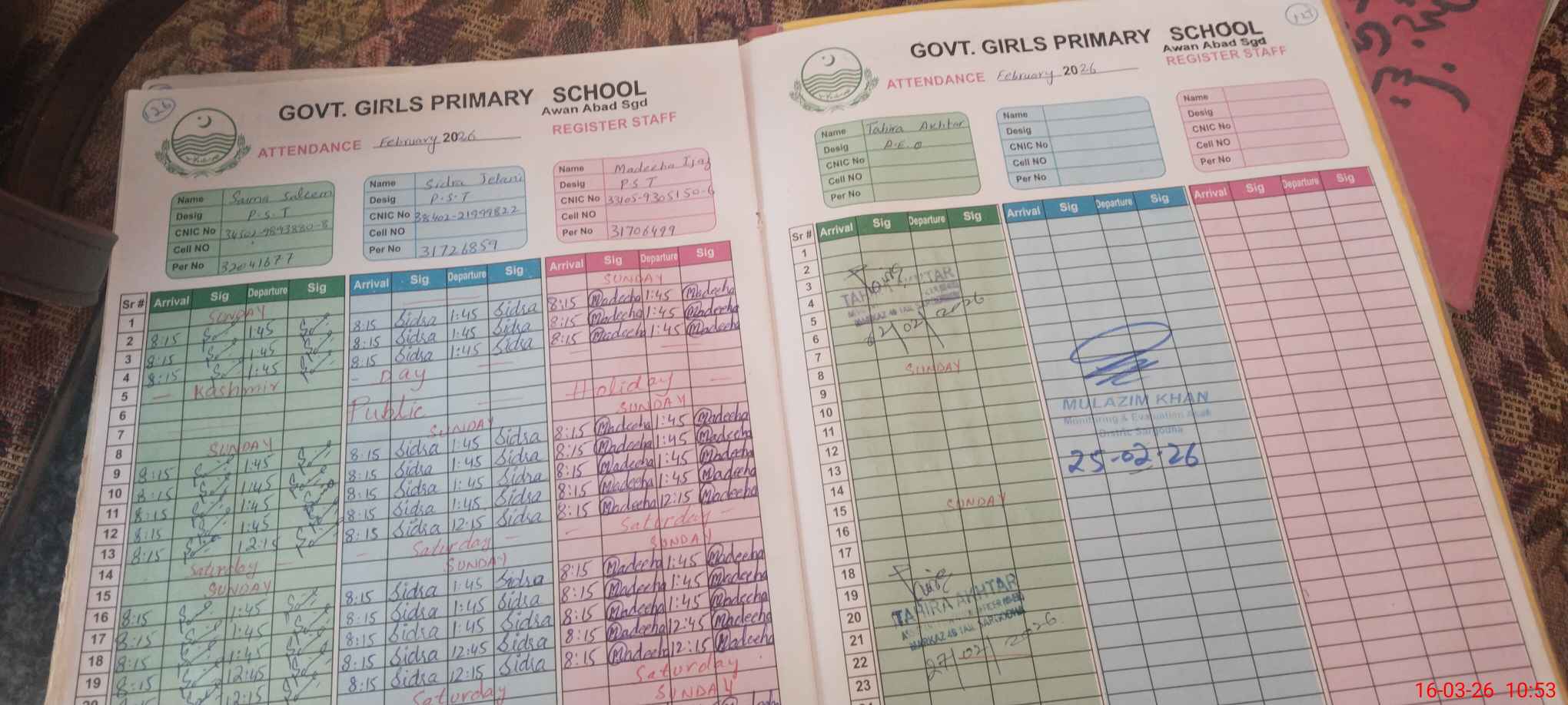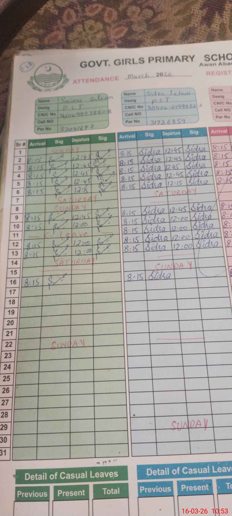 | CNIC | Full Name | Designation | R/C | Absence During Last Calender Month |