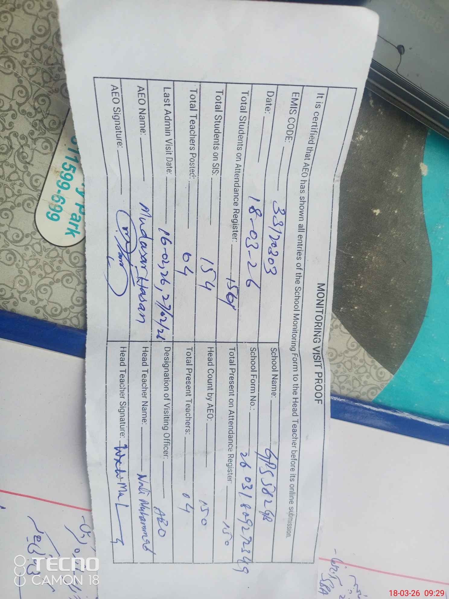 | Attendance Register | Head Teacher | MEA with School | Visit Proof |
