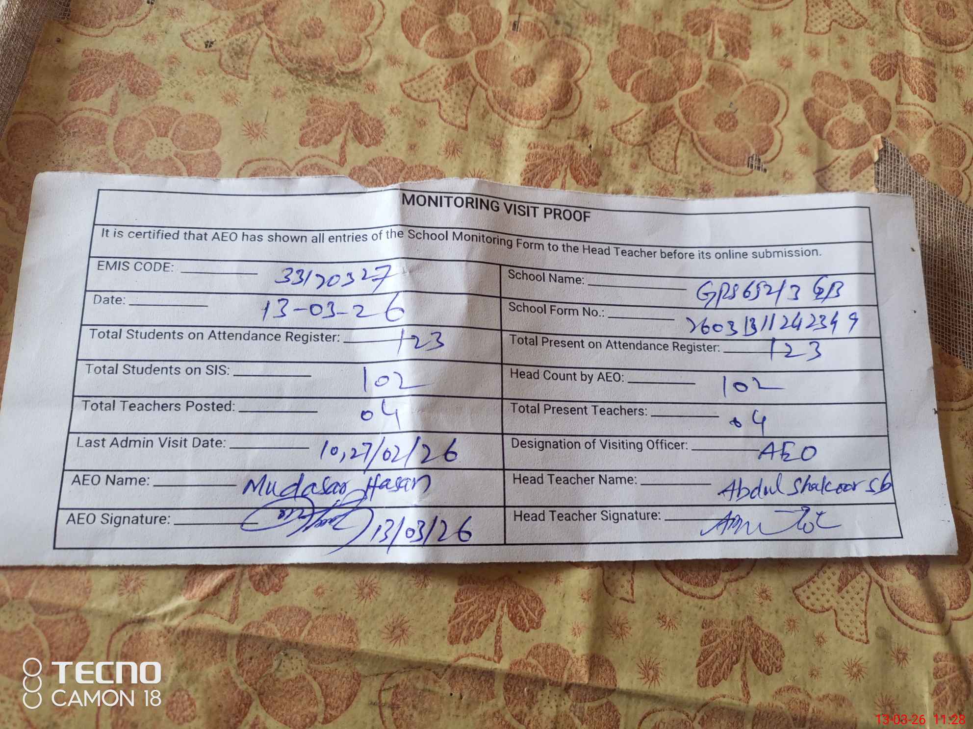| Attendance Register | Head Teacher | MEA with School | Visit Proof |