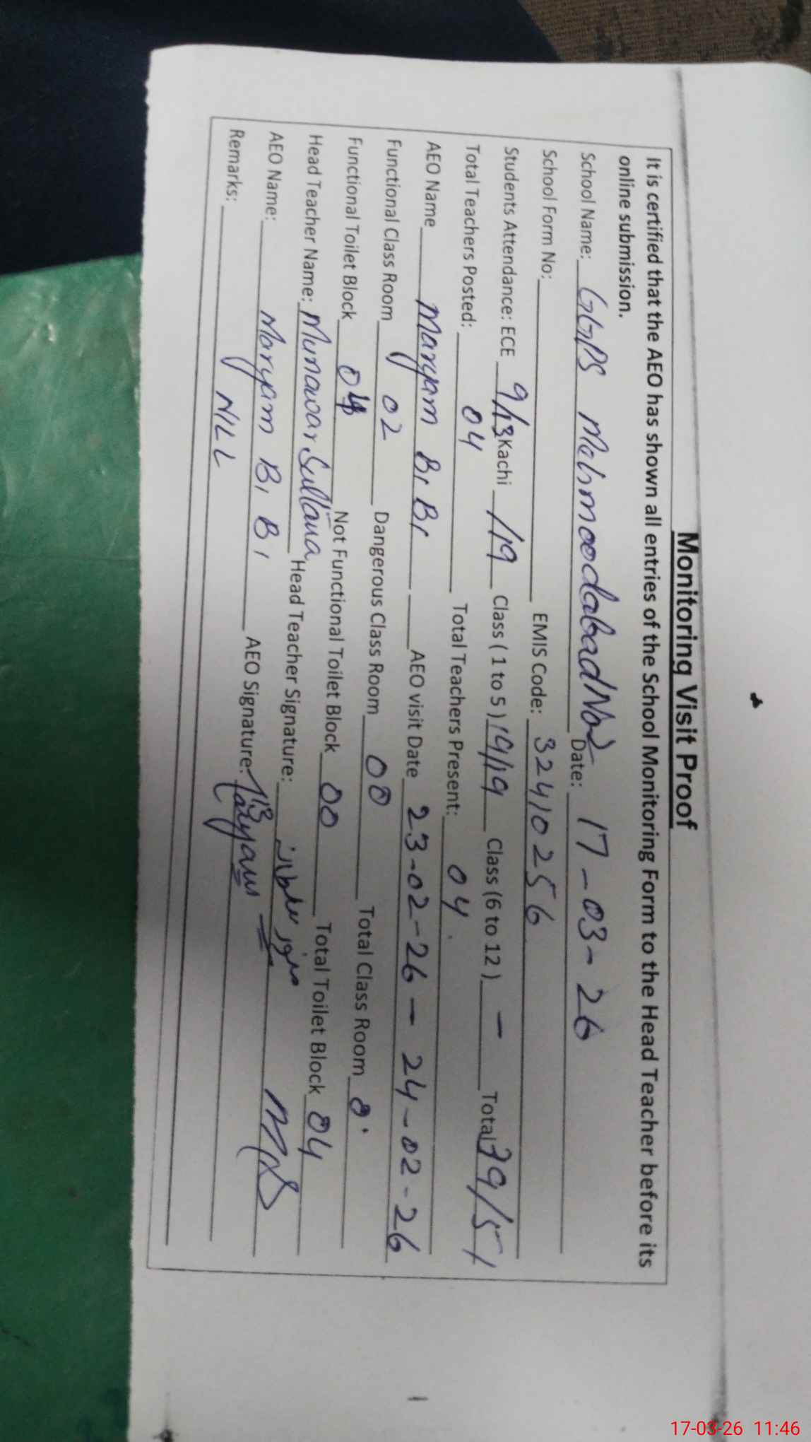 | EMIS Code: 32410256 | Name of School: GGPS MEHMOOD ABAD NO. 2 | |||