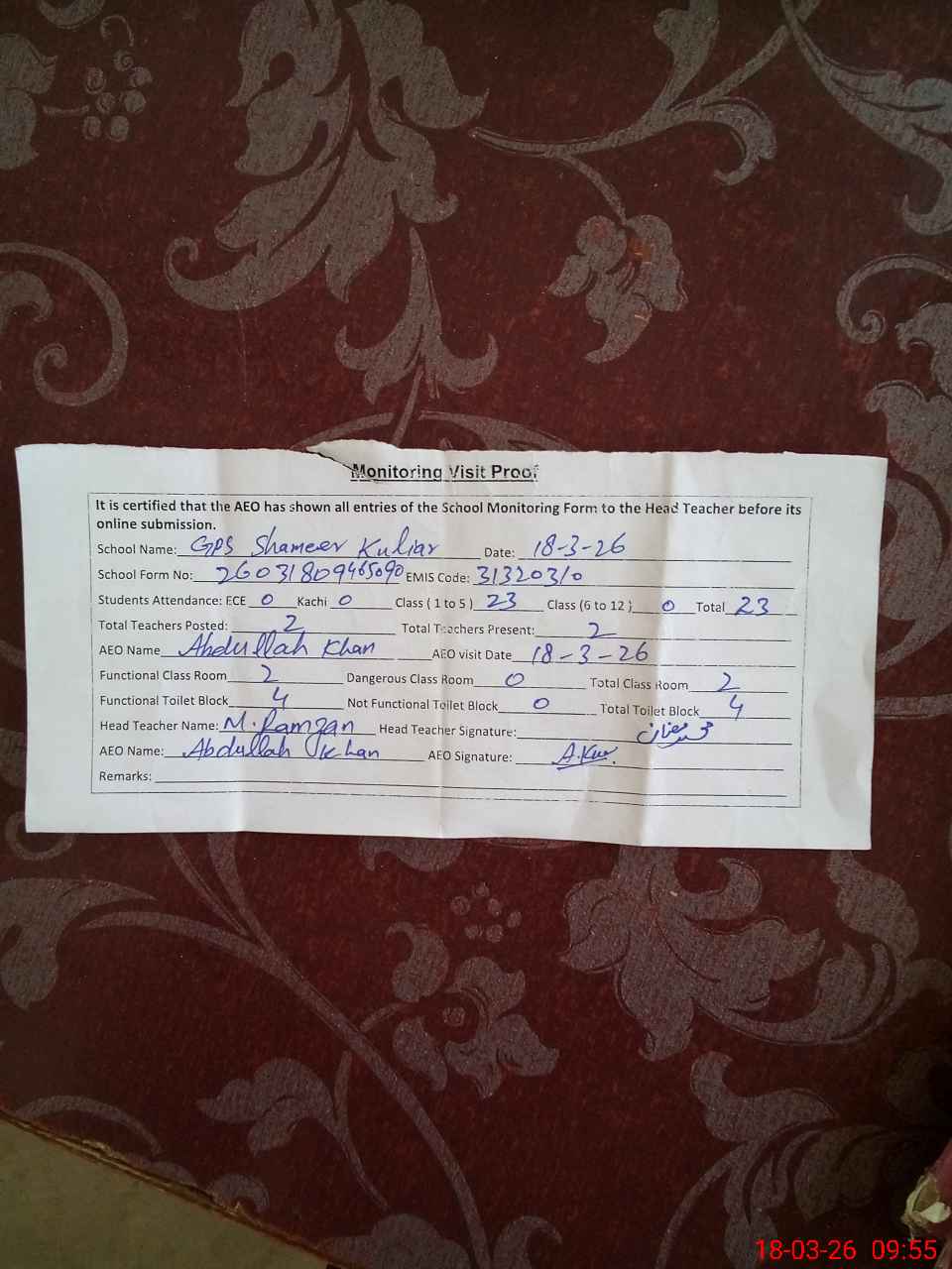 | Attendance Register | Head Teacher | MEA with School | Visit Proof |