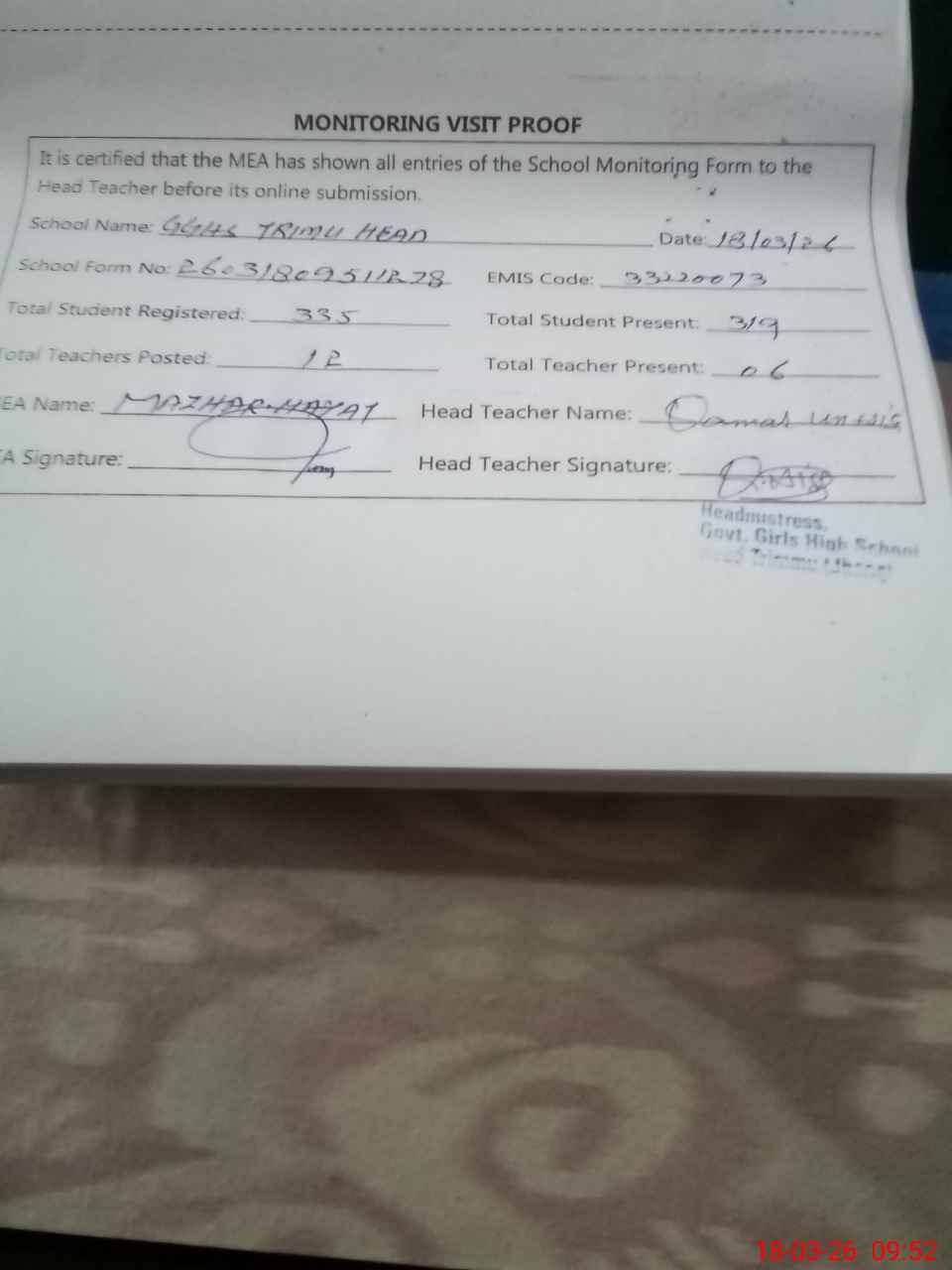 | Attendance Register | Head Teacher | MEA with School | Visit Proof |