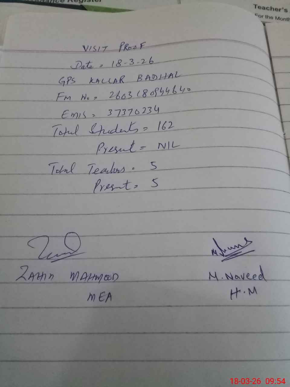 | Attendance Register | Head Teacher | MEA with School | Visit Proof |